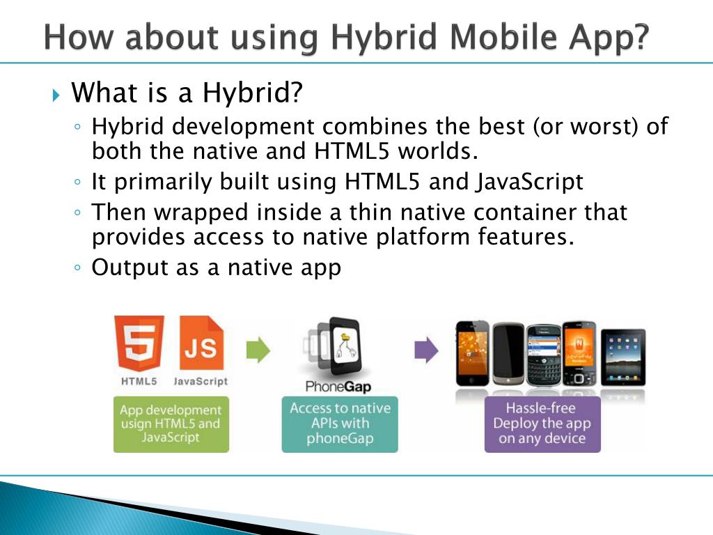 How about using Hybrid Mobile App? • What is a Hybrid? • Hybrid development combines the best (or worst) of both the native and HTML5 worlds. • It primarily built using HTML5 and JavaScript • Then wrapped inside a thin native container that provides access to native platform features. • Output as a native app
