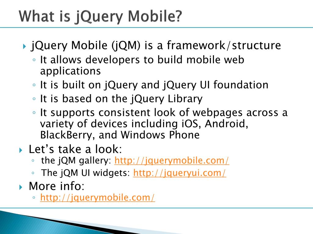 What is jQuery Mobile? • jQuery Mobile (jQM) is a framework/structure • It allows developers to build mobile web applications • It is built on jQuery and jQuery UI foundation • It is based on the jQuery Library • It supports consistent look of webpages across a variety of devices including iOS, Android, BlackBerry, and Windows Phone • Let’s take a look: • the jQM gallery: http://jquerymobile.com/ • The jQM UI widgets: http://jqueryui.com/ • More info: • http://jquerymobile.com/