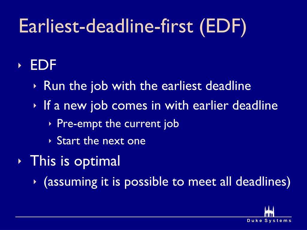 Earliest-deadline-first (EDF) • EDF • Run the job with the earliest deadline • If a new job comes in with earlier deadline • Pre-empt the current job • Start the next one • This is optimal • (assuming it is possible to meet all deadlines)