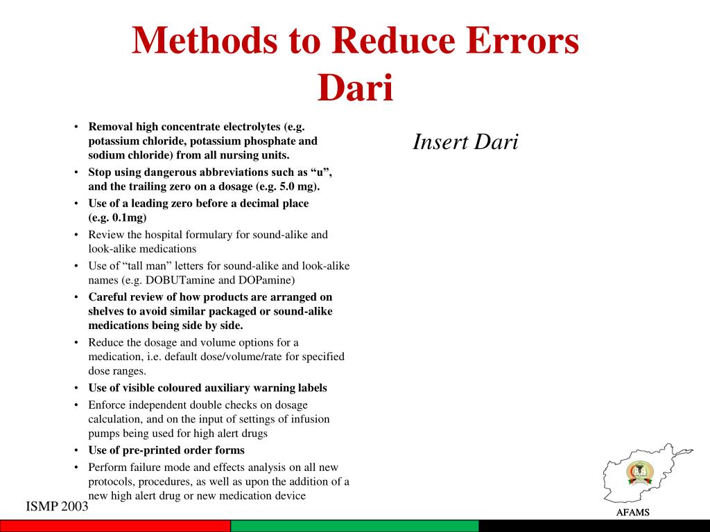 Methods to Reduce Errors Dari • Insert Dari • Removal high concentrate electrolytes (e.g. potassium chloride, potassium phosphate and sodium chloride) from all nursing units. • Stop using dangerous abbreviations such as “u”, and the trailing zero on a dosage (e.g. 5.0 mg). • Use of a leading zero before a decimal place (e.g. 0.1mg) • Review the hospital formulary for sound-alike and look-alike medications • Use of “tall man” letters for sound-alike and look-alike names (e.g. DOBUTamine and DOPamine) • Careful review of how products are arranged on shelves to avoid similar packaged or sound-alike medications being side by side. • Reduce the dosage and volume options for a medication, i.e. default dose/volume/rate for specified dose ranges. • Use of visible coloured auxiliary warning labels • Enforce independent double checks on dosage calculation, and on the input of settings of infusion pumps being used for high alert drugs • Use of pre-printed order forms • Perform failure mode and effects analysis on all new protocols, procedures, as well as upon the addition of a new high alert drug or new medication device ISMP 2003 AFAMS