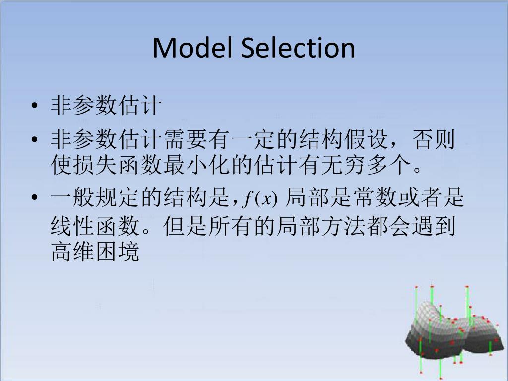 Model Selection • 非参数估计 • 非参数估计需要有一定的结构假设,否则使损失函数最小化的估计有无穷多个。 • 一般规定的结构是,局部是常数或者是线性函数。但是所有的局部方法都会遇到高维困境