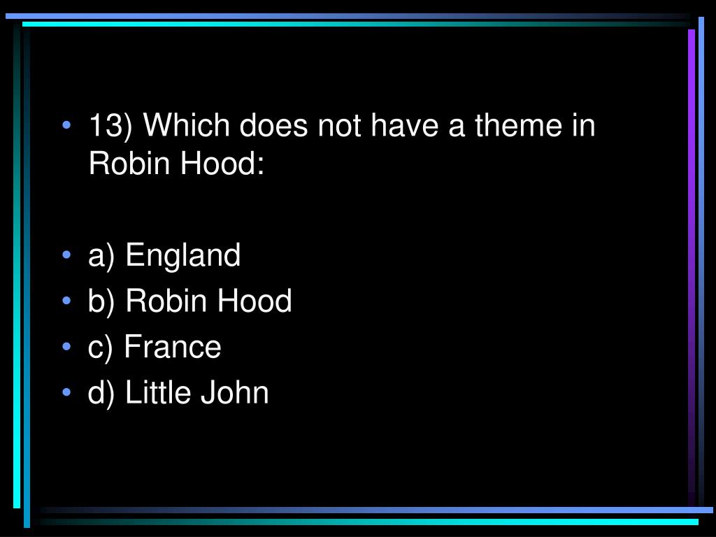 13) Which does not have a theme in Robin Hood: • a) England • b) Robin Hood • c) France • d) Little John