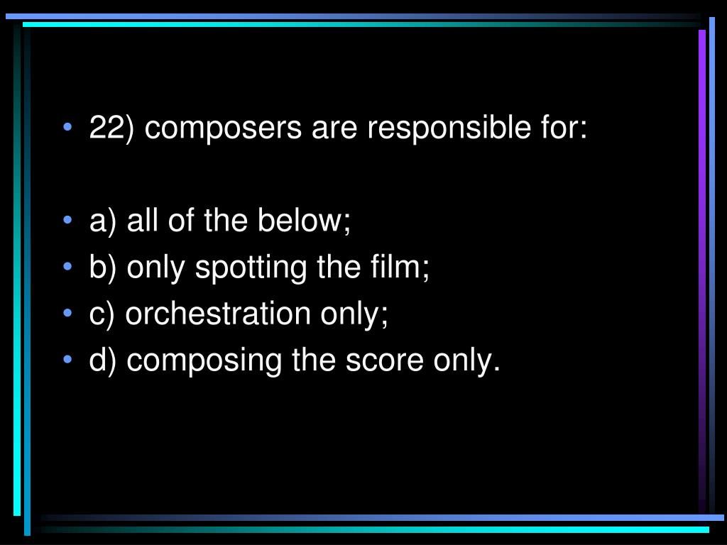 22) composers are responsible for: • a) all of the below; • b) only spotting the film; • c) orchestration only; • d) composing the score only.
