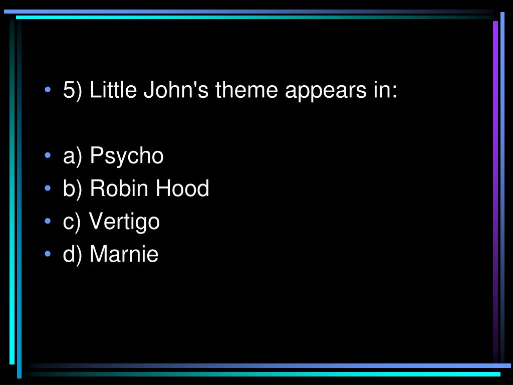 5) Little John's theme appears in: • a) Psycho • b) Robin Hood • c) Vertigo • d) Marnie
