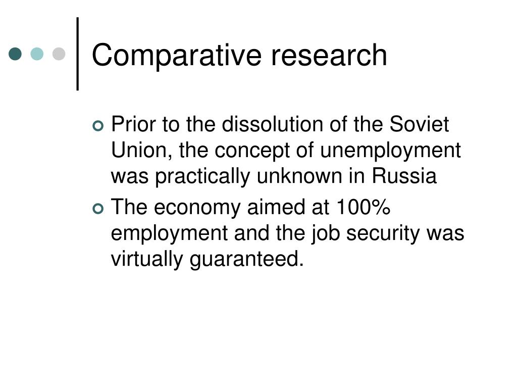 Comparative research • Prior to the dissolution of the Soviet Union, the concept of unemployment was practically unknown in Russia • The economy aimed at 100% employment and the job security was virtually guaranteed.
