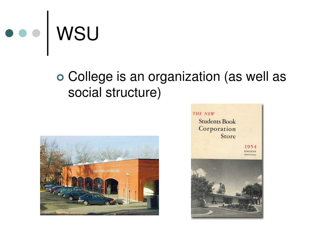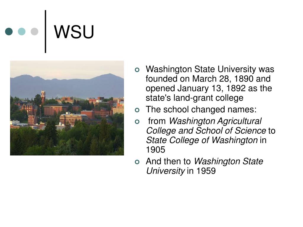 WSU • Washington State University was founded on March 28, 1890 and opened January 13, 1892 as the state's land-grant college • The school changed names: • from Washington Agricultural College and School of Science to State College of Washington in 1905 • And then to Washington State University in 1959