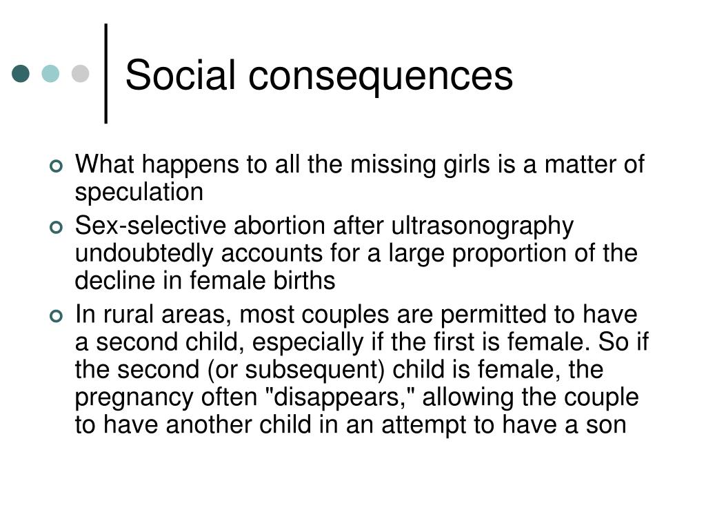Social consequences • What happens to all the missing girls is a matter of speculation • Sex-selective abortion after ultrasonography undoubtedly accounts for a large proportion of the decline in female births • In rural areas, most couples are permitted to have a second child, especially if the first is female. So if the second (or subsequent) child is female, the pregnancy often "disappears," allowing the couple to have another child in an attempt to have a son