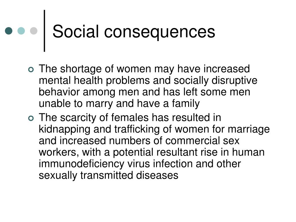 Social consequences • The shortage of women may have increased mental health problems and socially disruptive behavior among men and has left some men unable to marry and have a family • The scarcity of females has resulted in kidnapping and trafficking of women for marriage and increased numbers of commercial sex workers, with a potential resultant rise in human immunodeficiency virus infection and other sexually transmitted diseases