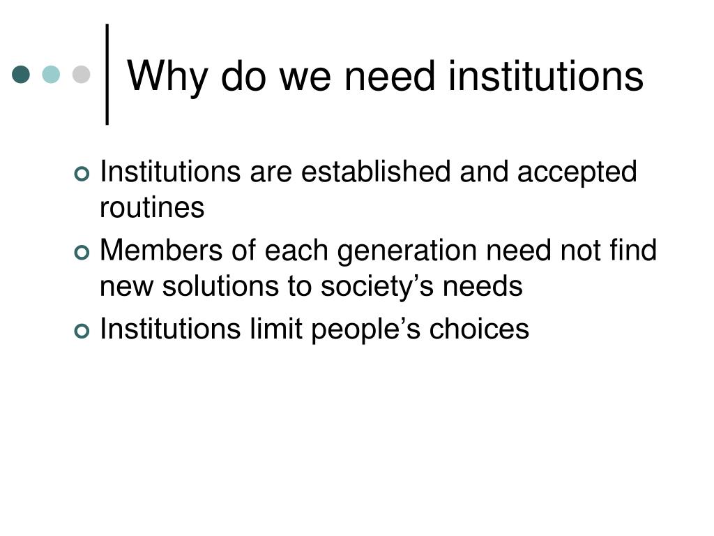 Why do we need institutions • Institutions are established and accepted routines • Members of each generation need not find new solutions to society’s needs • Institutions limit people’s choices