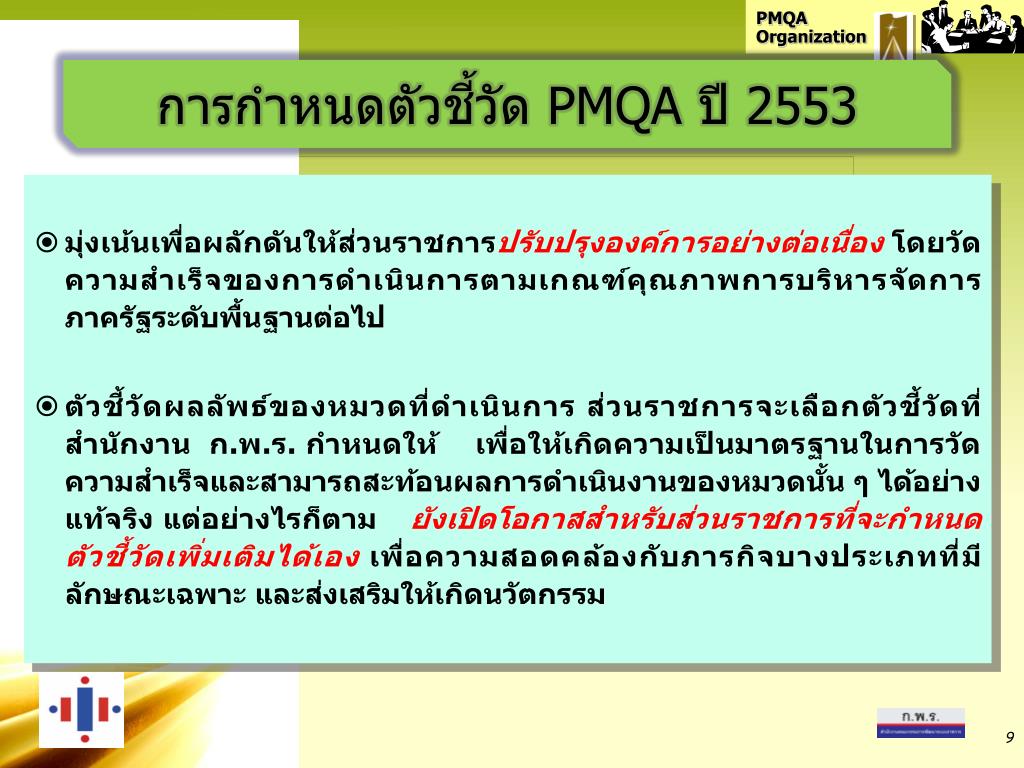 การพัฒนาคุณภาพการบริหารจัดการภาครัฐ ประจำปีงบประมาณ พ.ศ. 2553 ส่วนราชการระดับกรม. PMQA. Public Sector Management Quality Award. หัวข้อการนำเสนอ. 1. ภาพรวมการพัฒนาคุณภาพการบริหารจัดการภาครัฐ 2. ทิศทางการพัฒนาคุณภาพการบริหารจัดการภาครัฐ ปีงบประมาณ 2553
