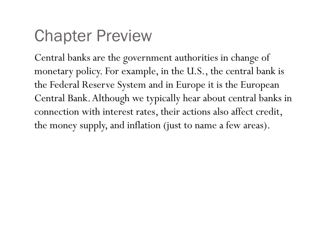 Chapter Preview Central banks are the government authorities in change of monetary policy. For example, in the U.S., the central bank is the Federal Reserve System and in Europe it is the European Central Bank. Although we typically hear about central banks in connection with interest rates, their actions also affect credit, the money supply, and inflation (just to name a few areas).