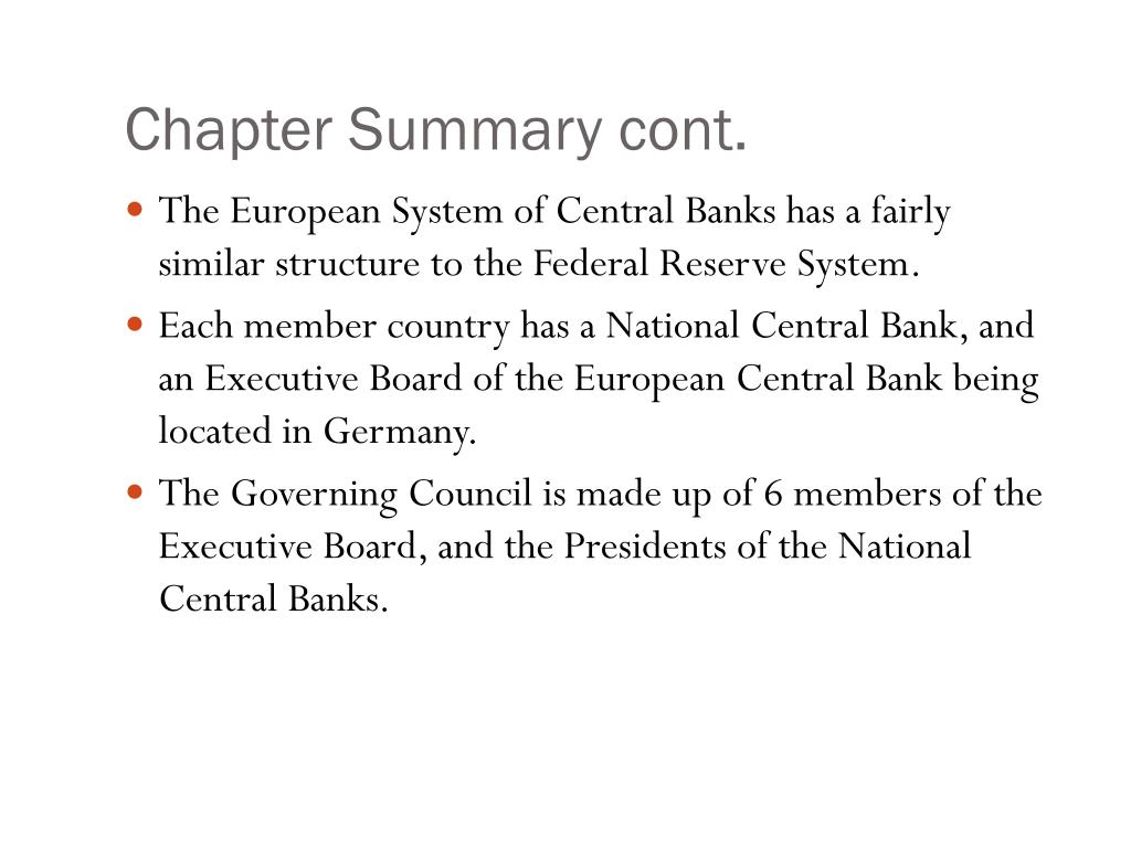 Chapter Summary cont. • The European System of Central Banks has a fairly similar structure to the Federal Reserve System. • Each member country has a National Central Bank, and an Executive Board of the European Central Bank being located in Germany. • The Governing Council is made up of 6 members of the Executive Board, and the Presidents of the National Central Banks.