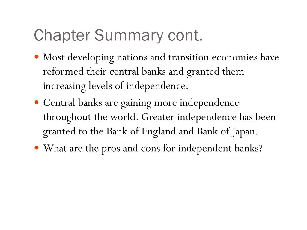 Chapter Summary cont. • Most developing nations and transition economies have reformed their central banks and granted them increasing levels of independence. • Central banks are gaining more independence throughout the world. Greater independence has been granted to the Bank of England and Bank of Japan. • What are the pros and cons for independent banks?