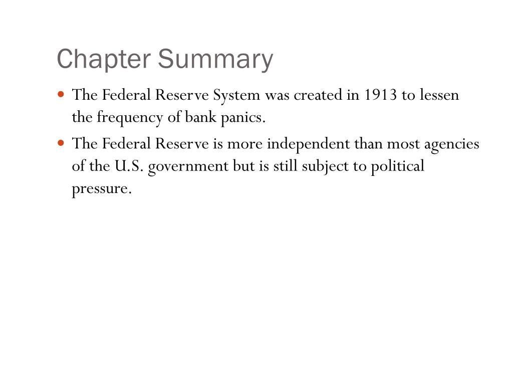 Chapter Summary • The Federal Reserve System was created in 1913 to lessen the frequency of bank panics. • The Federal Reserve is more independent than most agencies of the U.S. government but is still subject to political pressure.