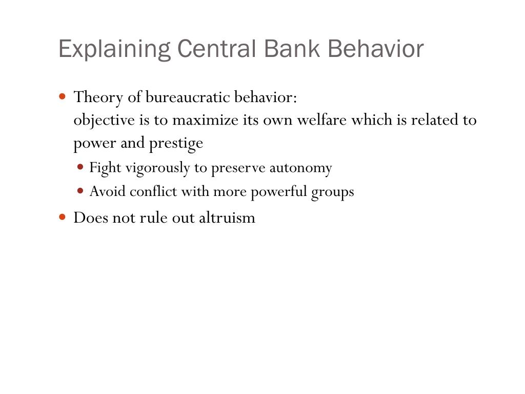 Explaining Central Bank Behavior • Theory of bureaucratic behavior:objective is to maximize its own welfare which is related to power and prestige • Fight vigorously to preserve autonomy • Avoid conflict with more powerful groups • Does not rule out altruism