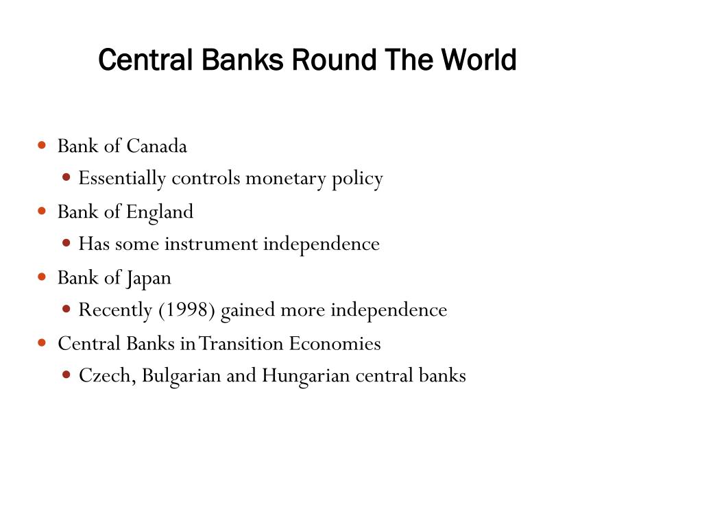 Central Banks Round The World • Bank of Canada • Essentially controls monetary policy • Bank of England • Has some instrument independence • Bank of Japan • Recently (1998) gained more independence • Central Banks in Transition Economies • Czech, Bulgarian and Hungarian central banks