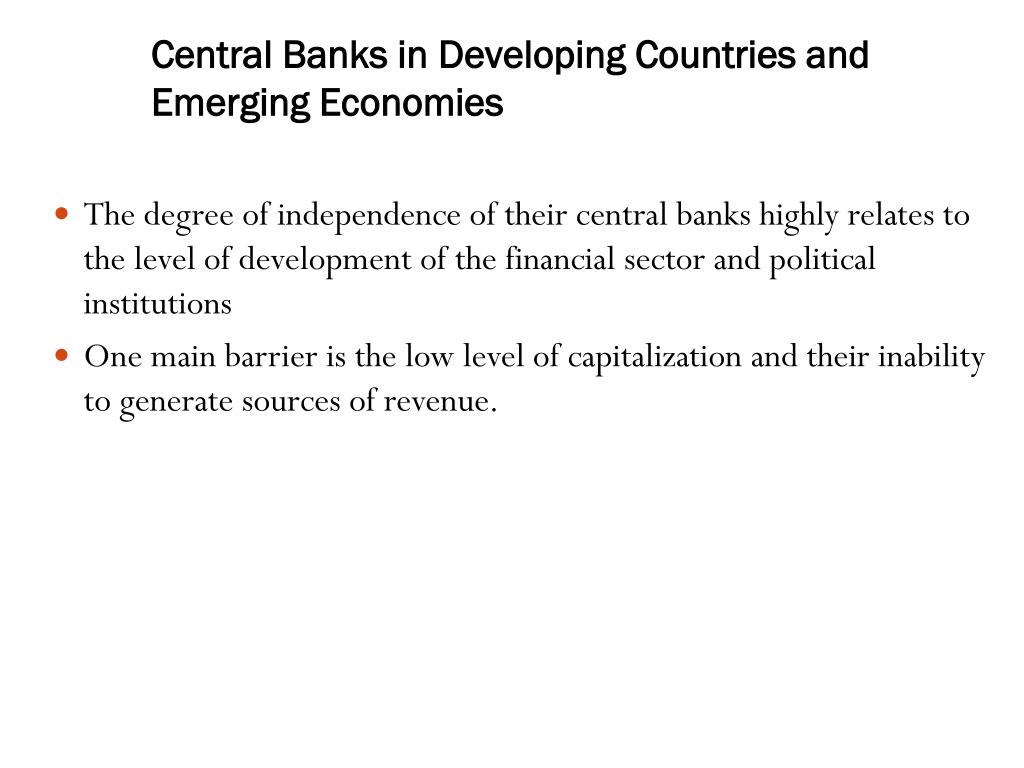 Central Banks in Developing Countries and Emerging Economies • The degree of independence of their central banks highly relates to the level of development of the financial sector and political institutions • One main barrier is the low level of capitalization and their inability to generate sources of revenue.