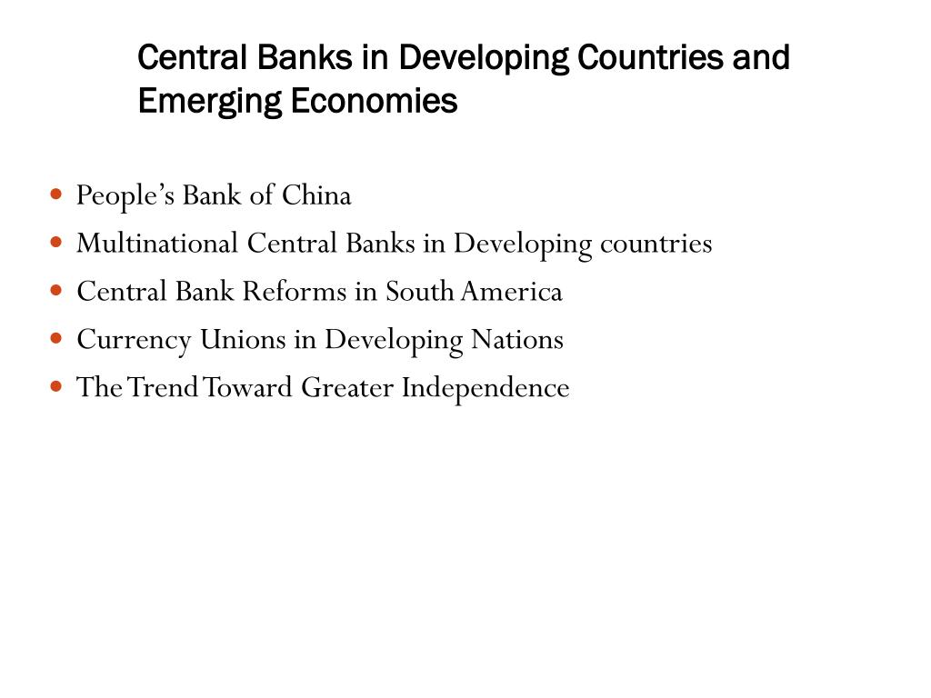 Central Banks in Developing Countries and Emerging Economies • People’s Bank of China • Multinational Central Banks in Developing countries • Central Bank Reforms in South America • Currency Unions in Developing Nations • The Trend Toward Greater Independence