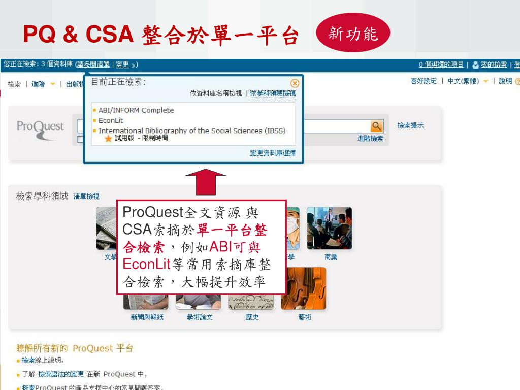 新功能 PQ & CSA 整合於單一平台 ProQuest全文資源 與 CSA索摘於單一平台整合檢索,例如ABI可與EconLit等常用索摘庫整合檢索,大幅提升效率