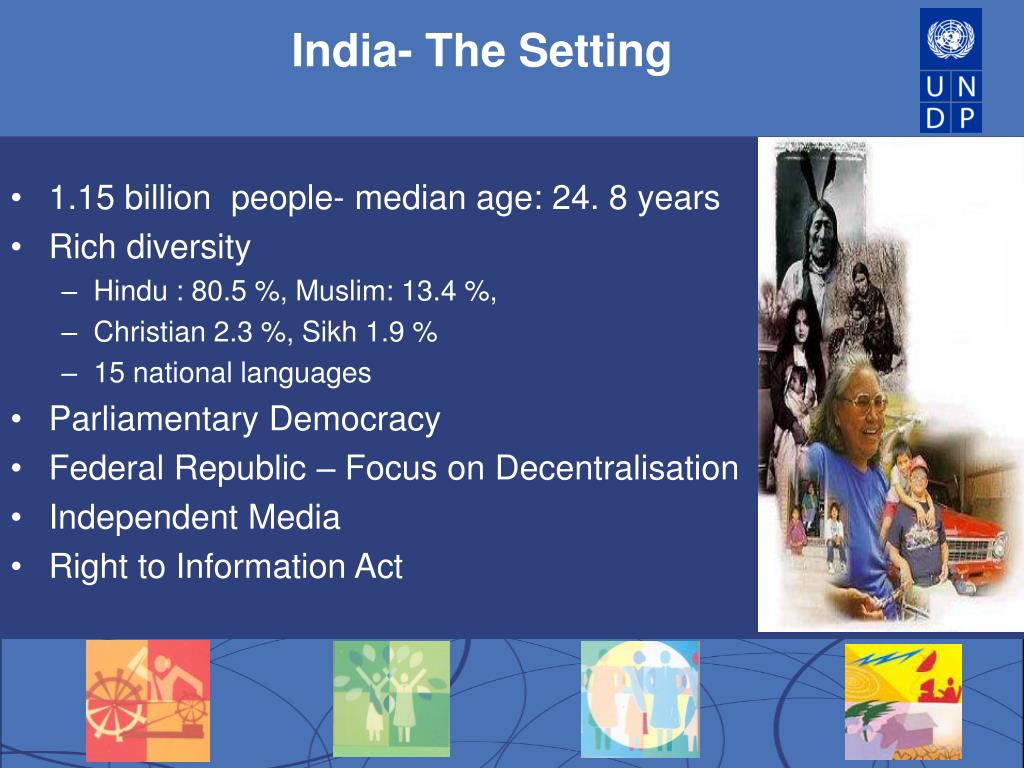 1.15 billion people- median age: 24. 8 years Rich diversity Hindu : 80.5 %, Muslim: 13.4 %, Christian 2.3 %, Sikh 1.9 % 15 national languages Parliamentary Democracy Federal Republic – Focus on Decentralisation Independent Media Right to Information Act India- The Setting