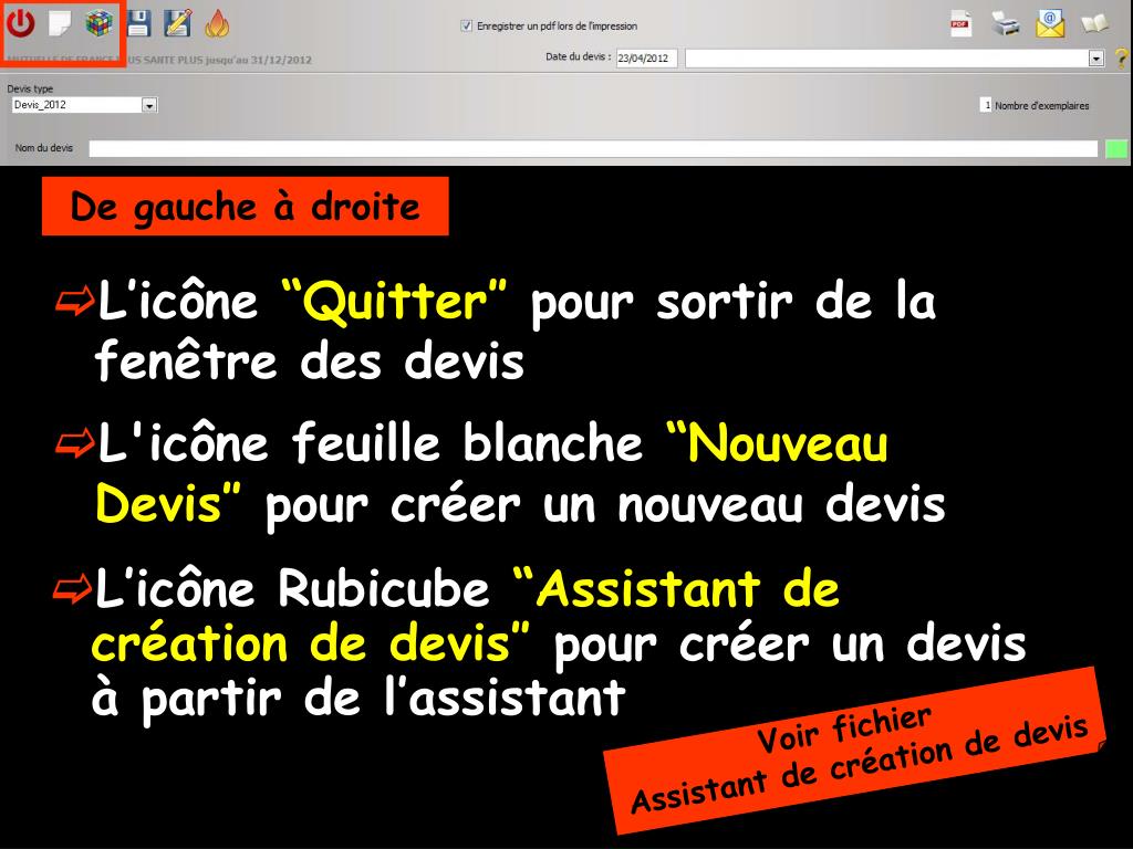 De gauche à droite • L’icône “Quitter″ pour sortir de la fenêtre des devis • L'icône feuille blanche “Nouveau Devis″ pour créer un nouveau devis • L’icône Rubicube “Assistant de création de devis″ pour créer un devis à partir de l’assistant Voir fichier Assistant de création de devis