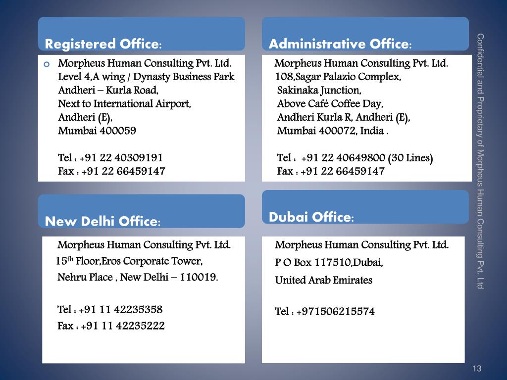Registered Office: • Morpheus Human Consulting Pvt. Ltd. Level 4,A wing / Dynasty Business Park Andheri – Kurla Road, Next to International Airport, Andheri (E), Mumbai 400059 Tel : +91 22 40309191 Fax : +91 22 66459147 Administrative Office: Morpheus Human Consulting Pvt. Ltd. 15th Floor,Eros Corporate Tower, Nehru Place , New Delhi – 110019. Tel : +91 11 42235358 Fax : +91 11 42235222 Morpheus Human Consulting Pvt. Ltd. 108,Sagar Palazio Complex, Sakinaka Junction, Above Café Coffee Day, Andheri Kurla R, Andheri (E), Mumbai 400072, India . Tel : +91 22 40649800 (30 Lines) Fax : +91 22 66459147 Dubai Office: New Delhi Office: • Morpheus Human Consulting Pvt. Ltd. • P O Box 117510,Dubai, • United Arab Emirates • Tel : +971506215574 Confidential and Proprietary of Morpheus Human Consulting Pvt. Ltd