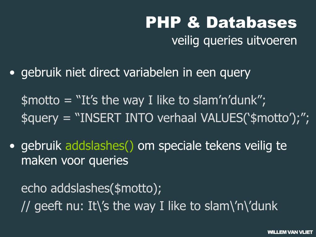 PHP & Databasesveilig queries uitvoeren • gebruik niet direct variabelen in een query $motto = “It’s the way I like to slam’n’dunk”; $query = “INSERT INTO verhaal VALUES(‘$motto’);”; • gebruik addslashes() om speciale tekens veilig te maken voor queries echo addslashes($motto); // geeft nu: It\’s the way I like to slam\’n\’dunk