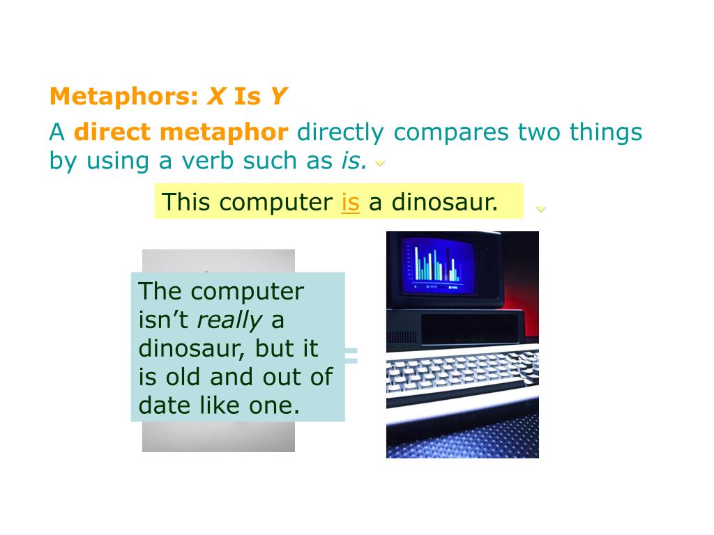 Metaphors: X Is Y A direct metaphor directly compares two things by using a verb such as is. This computer is a dinosaur. The computer isn’t really a dinosaur, but it is old and out of date like one. =