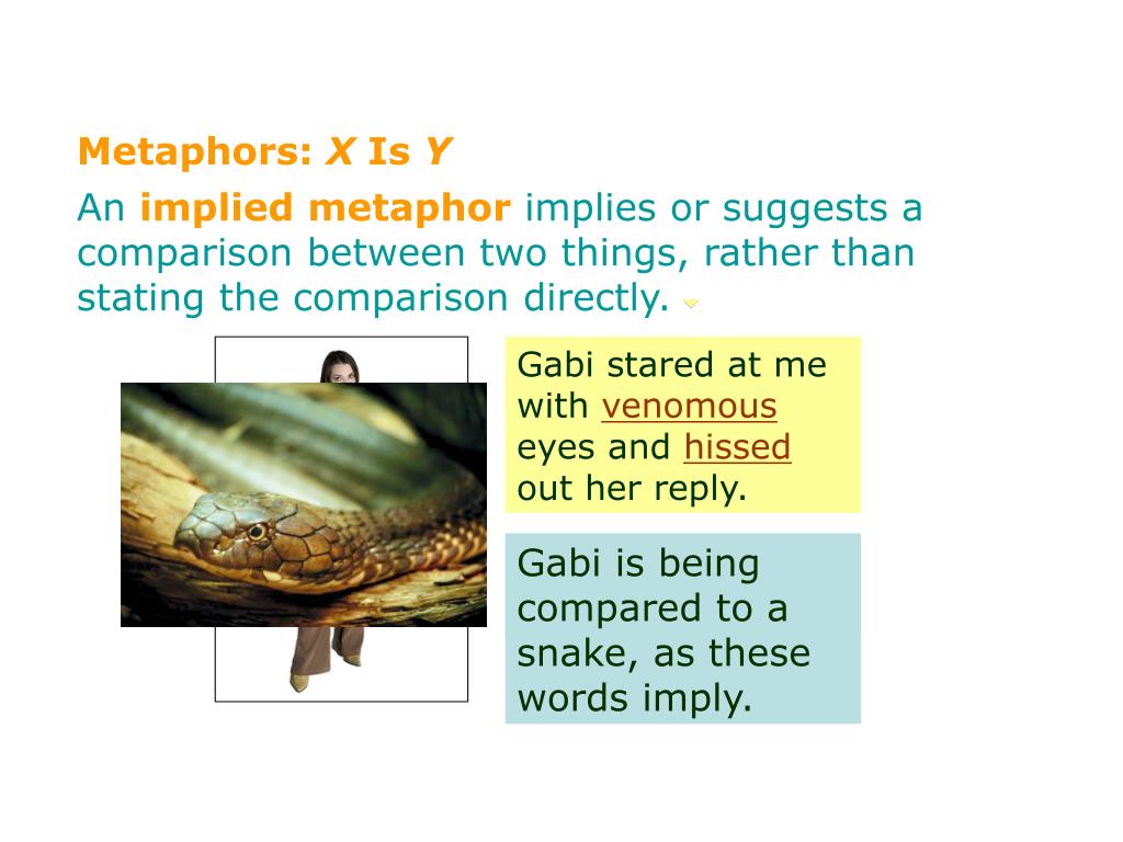Metaphors: X Is Y An implied metaphor implies or suggests a comparison between two things, rather than stating the comparison directly. Gabi stared at me with venomous eyes and hissed out her reply. Gabi stared at me with venomous eyes and hissed out her reply. Gabi is being compared to a snake, as these words imply. With what is Gabi being compared?