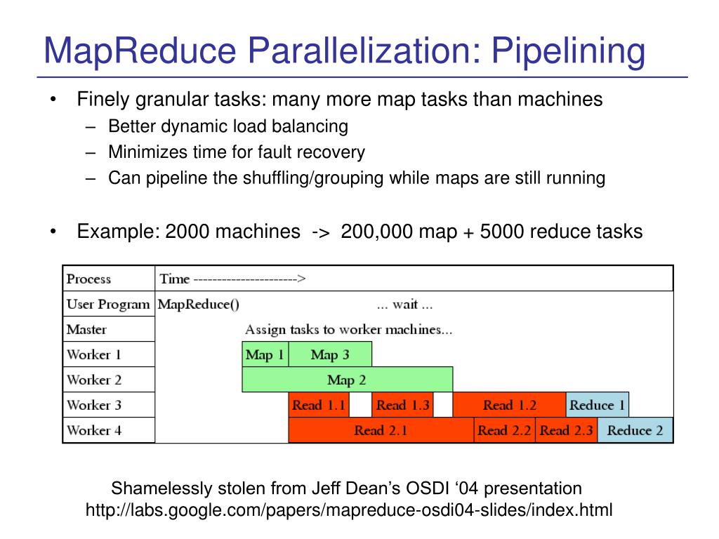 MapReduce Parallelization: Pipelining • Finely granular tasks: many more map tasks than machines • Better dynamic load balancing • Minimizes time for fault recovery • Can pipeline the shuffling/grouping while maps are still running • Example: 2000 machines -> 200,000 map + 5000 reduce tasks Shamelessly stolen from Jeff Dean’s OSDI ‘04 presentation http://labs.google.com/papers/mapreduce-osdi04-slides/index.html