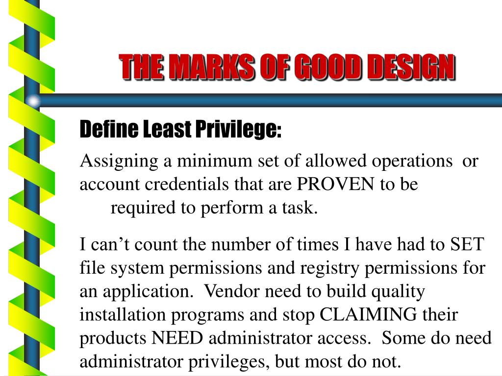 THE MARKS OF GOOD DESIGN Define Least Privilege: Assigning a minimum set of allowed operations or account credentials that are PROVEN to be required to perform a task. I can’t count the number of times I have had to SET file system permissions and registry permissions for an application. Vendor need to build quality installation programs and stop CLAIMING their products NEED administrator access. Some do need administrator privileges, but most do not.