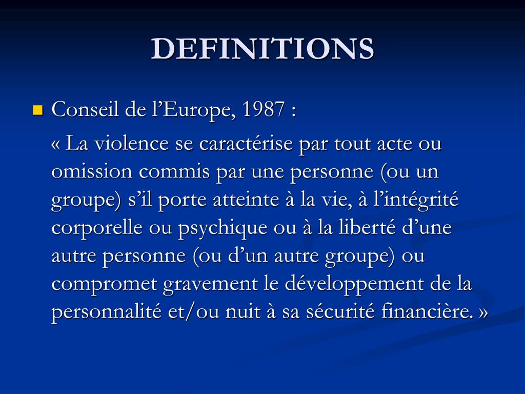 DEFINITIONS • Conseil de l’Europe, 1987 : « La violence se caractérise par tout acte ou omission commis par une personne (ou un groupe) s’il porte atteinte à la vie, à l’intégrité corporelle ou psychique ou à la liberté d’une autre personne (ou d’un autre groupe) ou compromet gravement le développement de la personnalité et/ou nuit à sa sécurité financière. »