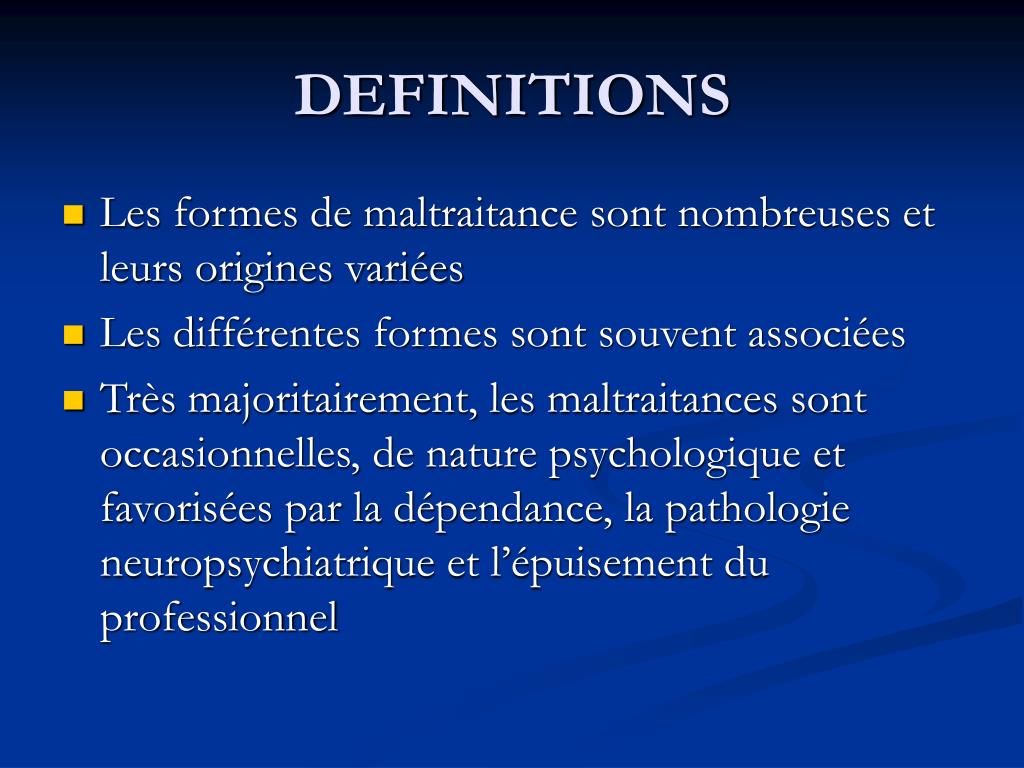 DEFINITIONS • Les formes de maltraitance sont nombreuses et leurs origines variées • Les différentes formes sont souvent associées • Très majoritairement, les maltraitances sont occasionnelles, de nature psychologique et favorisées par la dépendance, la pathologie neuropsychiatrique et l’épuisement du professionnel