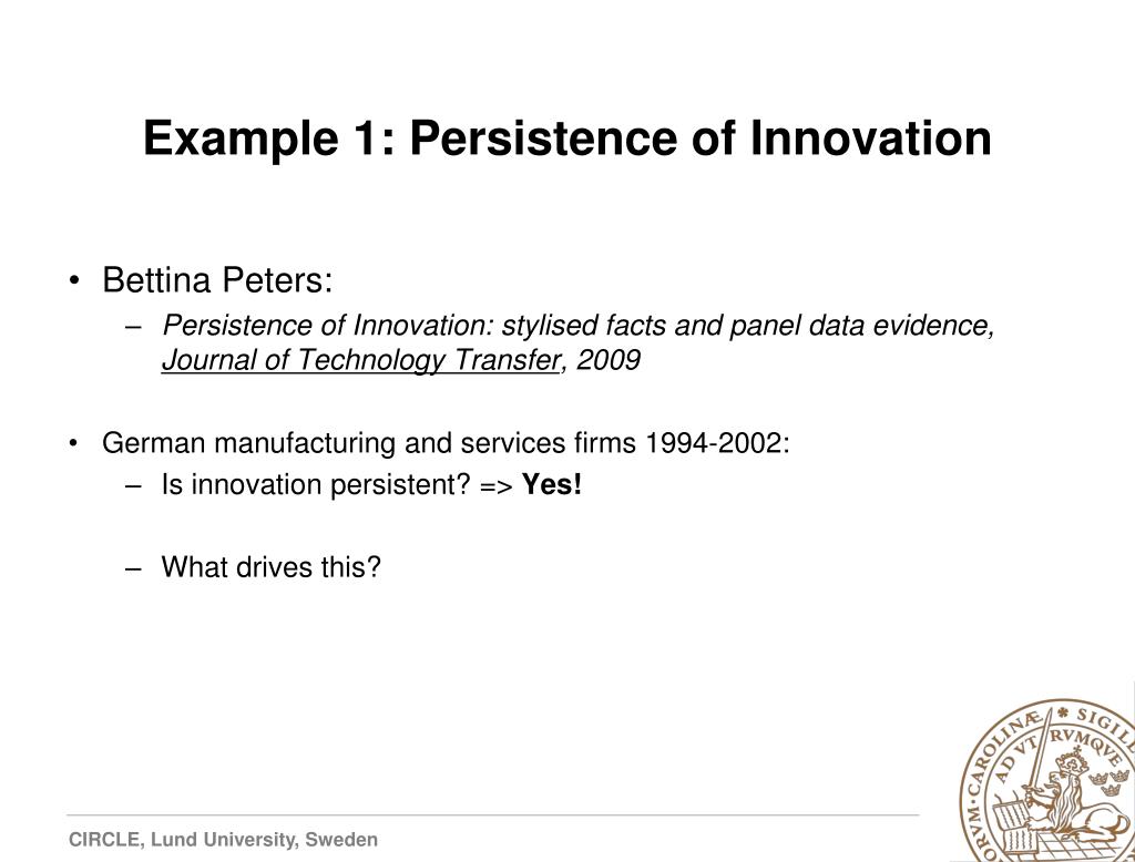 Example 1: Persistence of Innovation • Bettina Peters: • Persistence of Innovation: stylised facts and panel data evidence, Journal of Technology Transfer, 2009 • German manufacturing and services firms 1994-2002: • Is innovation persistent? => Yes! • What drives this?