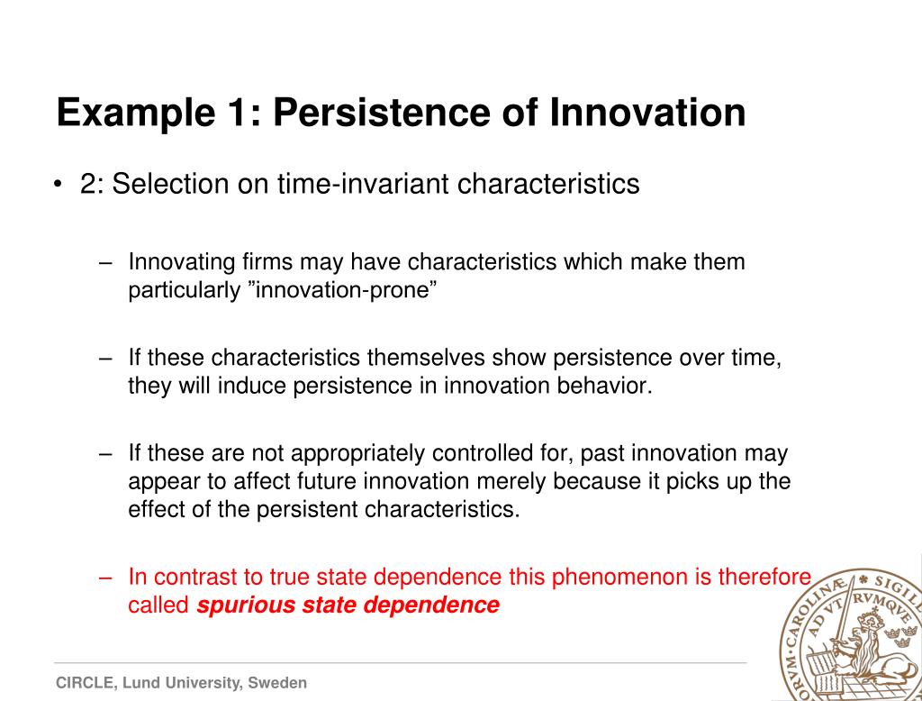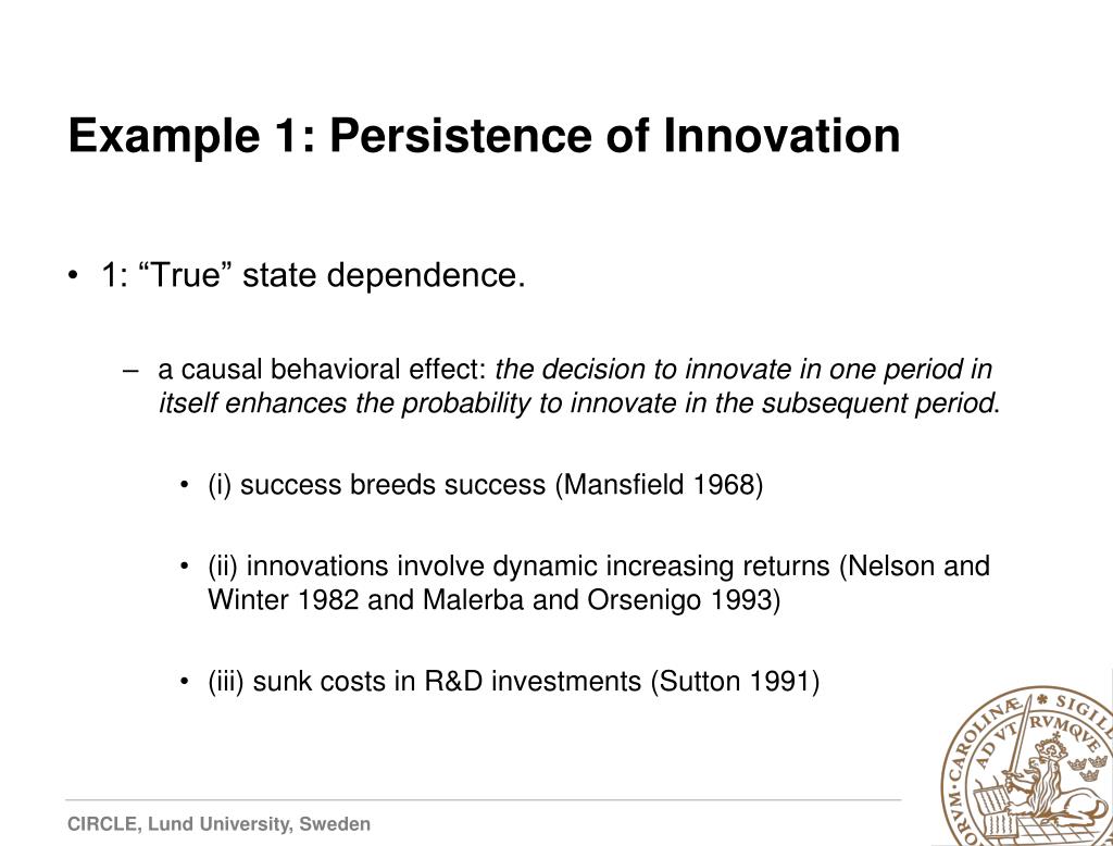 Example 1: Persistence of Innovation • 1: “True” state dependence. • a causal behavioral effect: the decision to innovate in one period in itself enhances the probability to innovate in the subsequent period. • (i) success breeds success (Mansfield 1968) • (ii) innovations involve dynamic increasing returns (Nelson and Winter 1982 and Malerba and Orsenigo 1993) • (iii) sunk costs in R&D investments (Sutton 1991)
