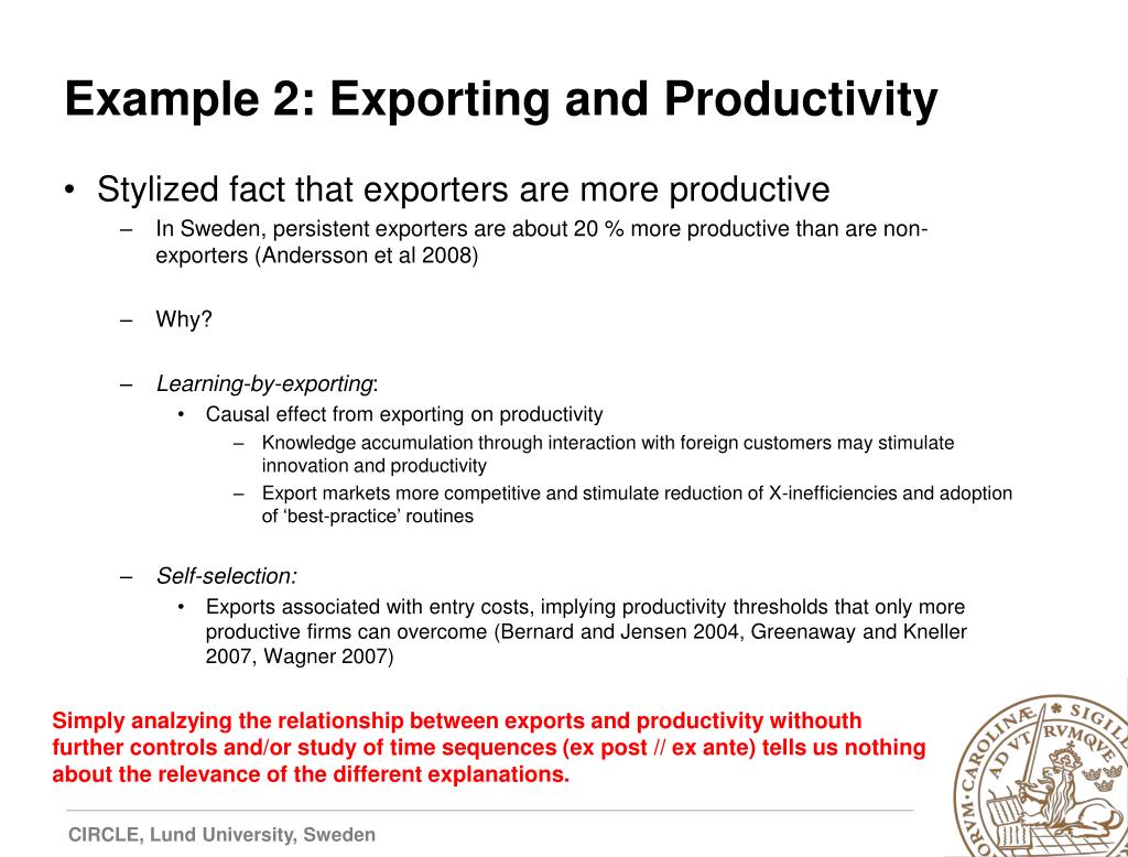 Example 2: Exporting and Productivity • Stylized fact that exporters are more productive • In Sweden, persistent exporters are about 20 % more productive than are non-exporters (Andersson et al 2008) • Why? • Learning-by-exporting: • Causal effect from exporting on productivity • Knowledge accumulation through interaction with foreign customers may stimulate innovation and productivity • Export markets more competitive and stimulate reduction of X-inefficiencies and adoption of ‘best-practice’ routines • Self-selection: • Exports associated with entry costs, implying productivity thresholds that only more productive firms can overcome (Bernard and Jensen 2004, Greenaway and Kneller 2007, Wagner 2007) Simplyanalzying the relationshipbetween exports and productivitywithouthfurthercontrols and/or study of time sequences (ex post // ex ante) tellsusnothingabout the relevance of the different explanations.