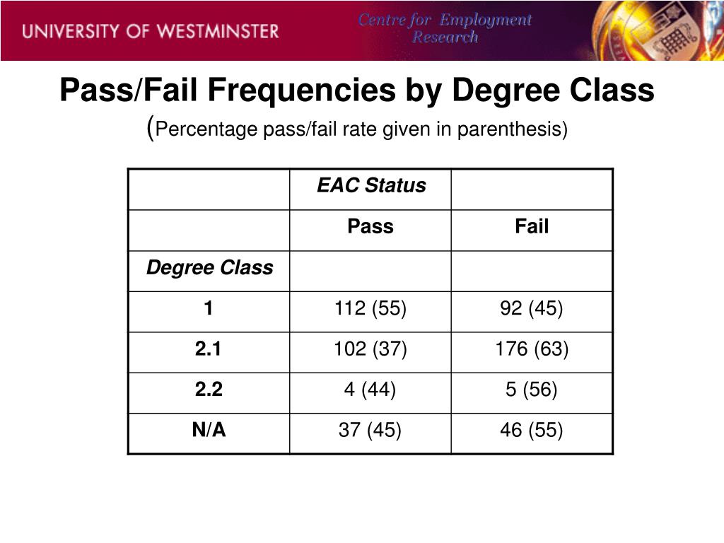 Centre for Employment Research Pass/Fail Frequencies by Degree Class(Percentage pass/fail rate given in parenthesis)