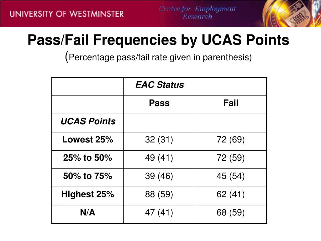 Centre for Employment Research Pass/Fail Frequencies by UCAS Points(Percentage pass/fail rate given in parenthesis)