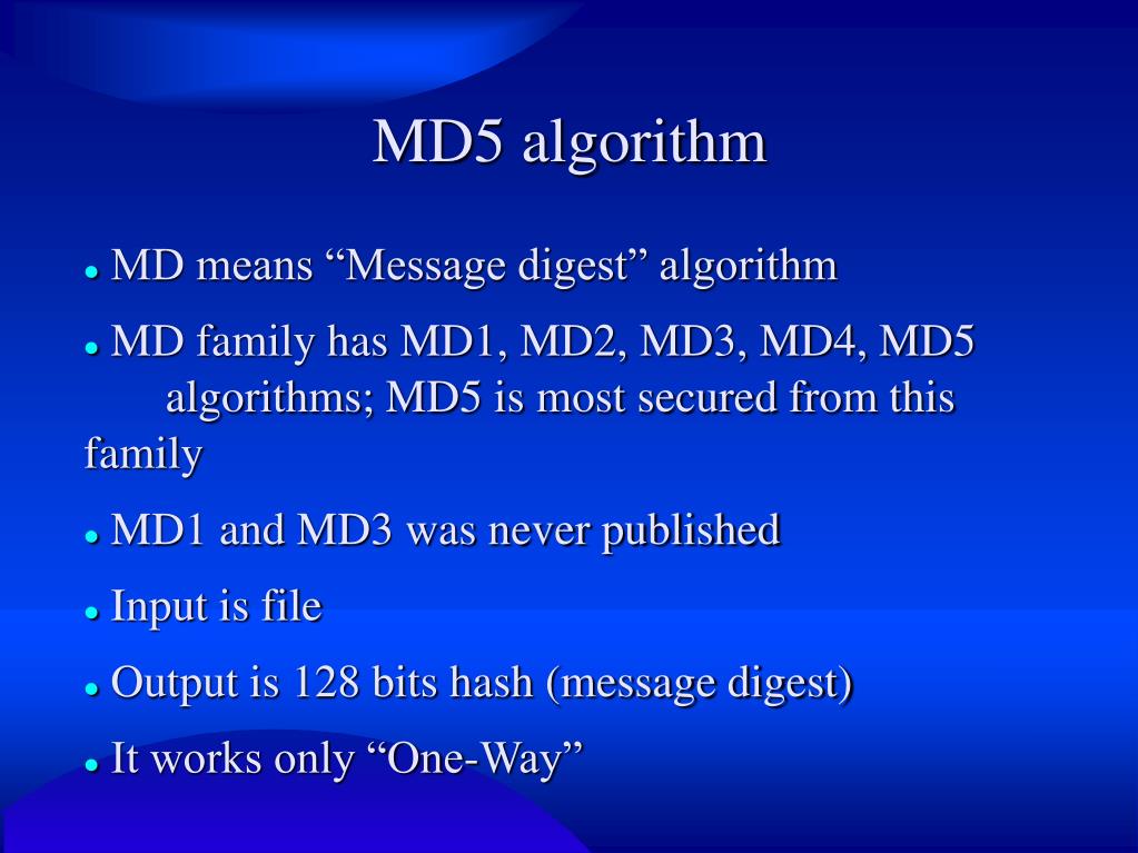MD5 algorithm • MD means “Message digest” algorithm • MD family has MD1, MD2, MD3, MD4, MD5 algorithms; MD5 is most secured from this family • MD1 and MD3 was never published • Input is file • Output is 128 bits hash (message digest) • It works only “One-Way”