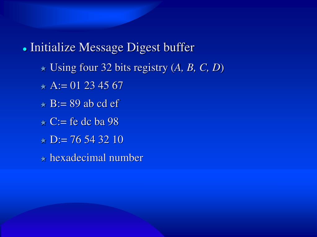 Initialize Message Digest buffer • Using four 32 bits registry (A, B, C, D) • A:= 01 23 45 67 • B:= 89 ab cd ef • C:= fe dc ba 98 • D:= 76 54 32 10 • hexadecimal number