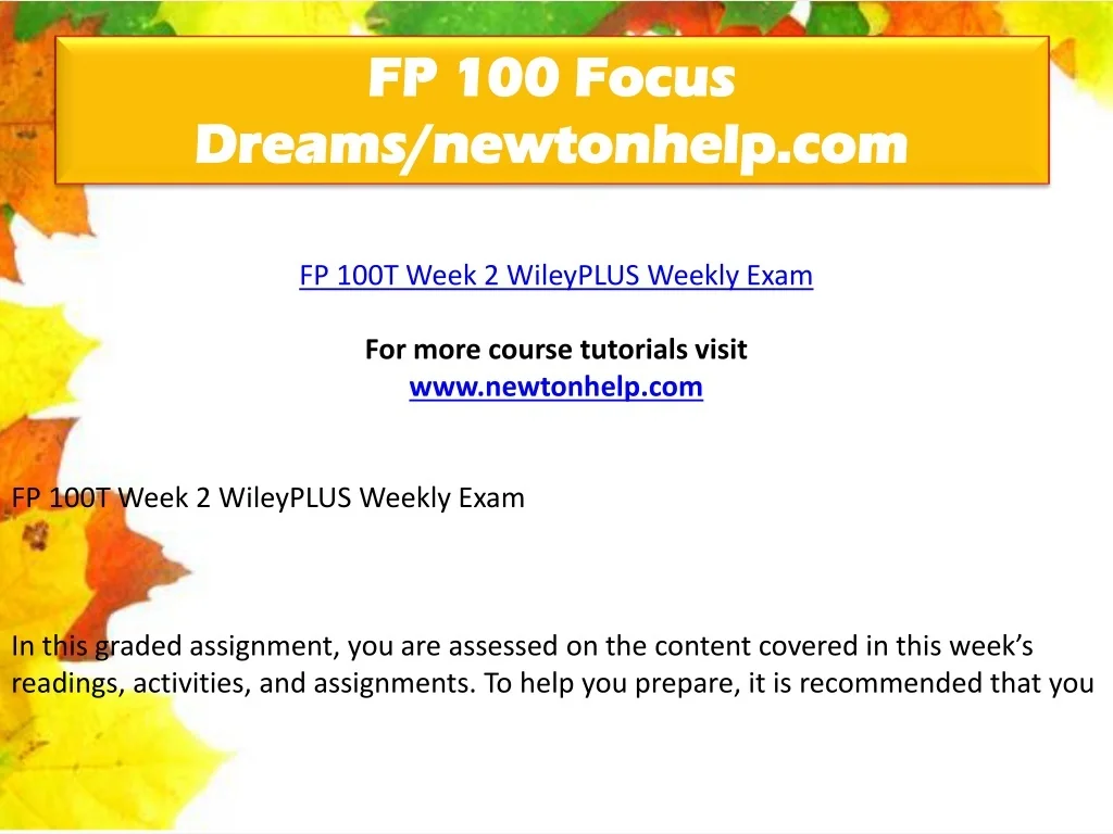 FP 100 Focus Dreams/newtonhelp.com FP 100T Week 2 WileyPLUS Weekly Exam For more course tutorials visit www.newtonhelp.com FP 100T Week 2 WileyPLUS Weekly Exam In this graded assignment, you are assessed on the content covered in this week’s readings, activities, and assignments. To help you prepare, it is recommended that you