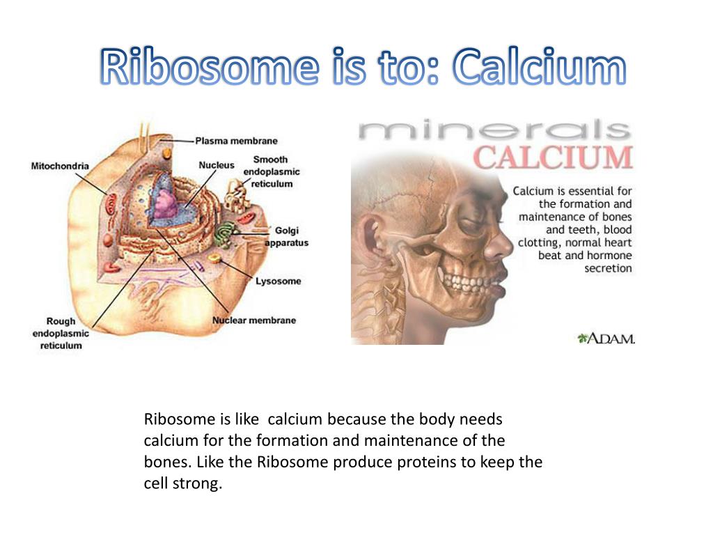 Ribosome is to: Calcium Ribosome is like calcium because the body needs calcium for the formation and maintenance of the bones. Like the Ribosome produce proteins to keep the cell strong.