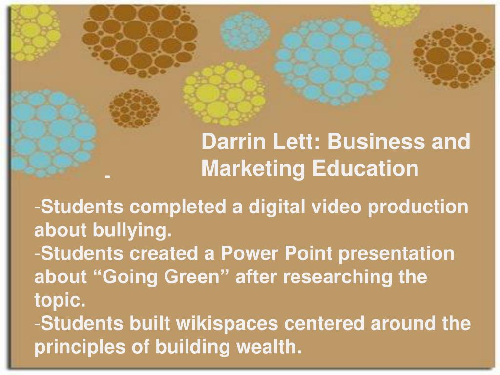 Darrin Lett: Business and Marketing Education - • Students completed a digital video production about bullying. • Students created a Power Point presentation about “Going Green” after researching the topic. • Students built wikispaces centered around the principles of building wealth.