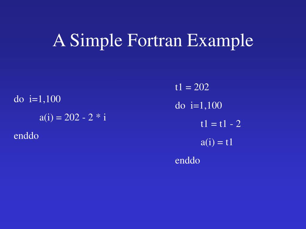 A Simple Fortran Example t1 = 202 do i=1,100 t1 = t1 - 2 a(i) = t1 enddo do i=1,100 a(i) = 202 - 2 * i enddo