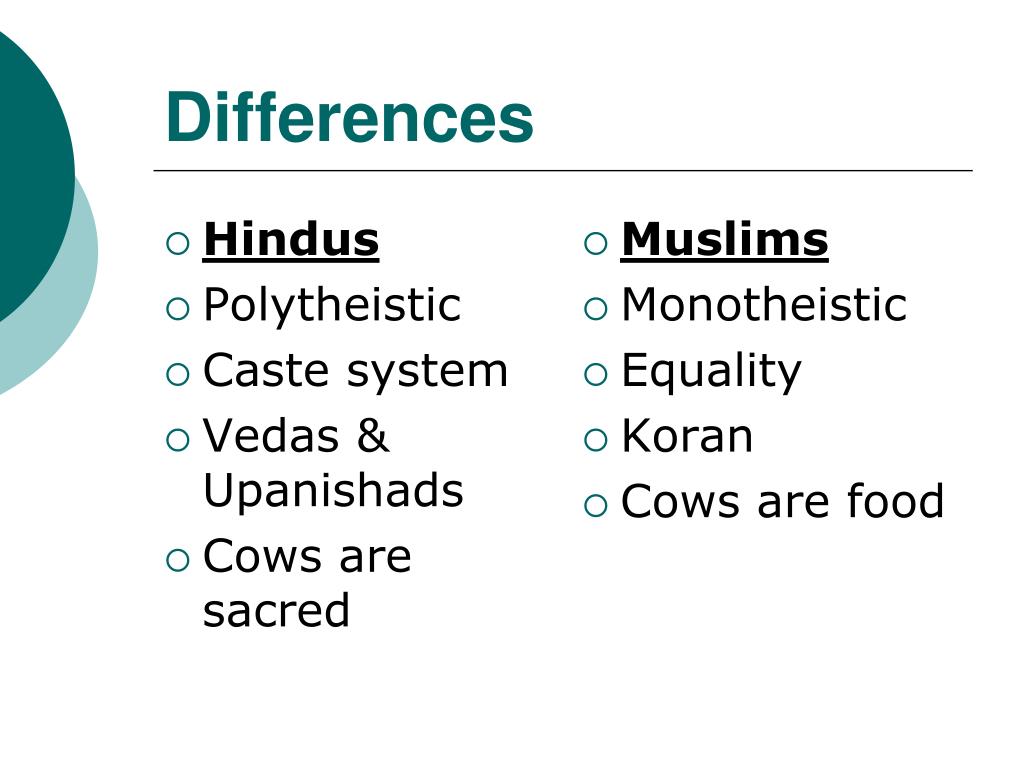 Hindus Polytheistic Caste system Vedas & Upanishads Cows are sacred Muslims Monotheistic Equality Koran Cows are food Differences