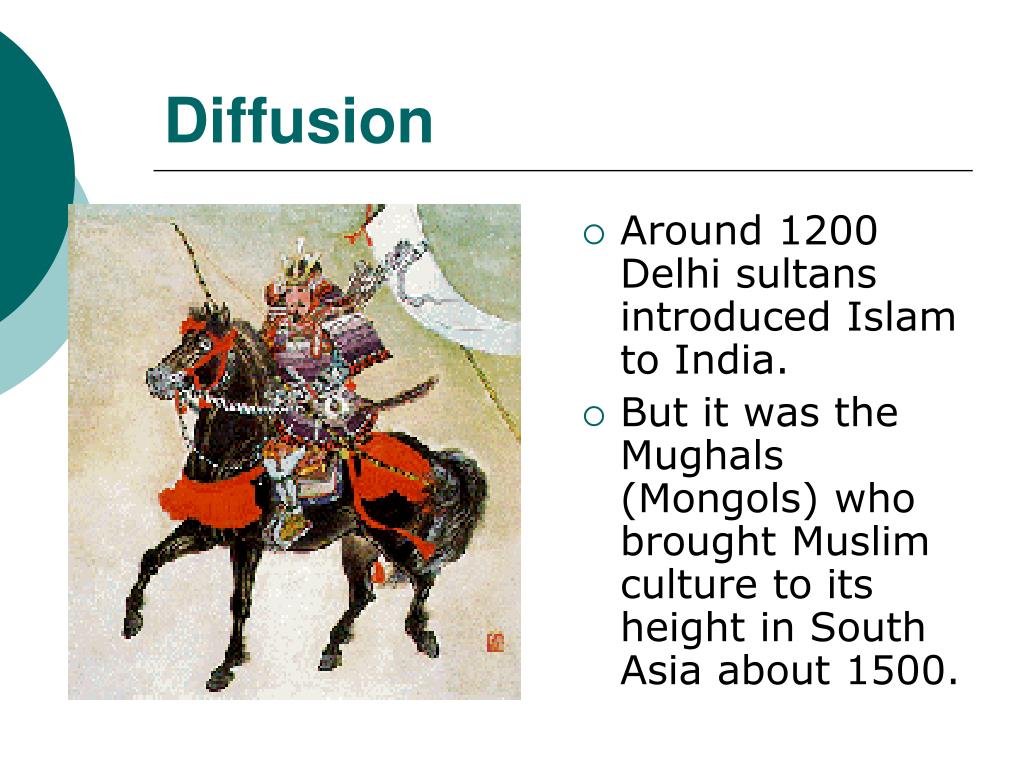 Diffusion • Around 1200 Delhi sultans introduced Islam to India. • But it was the Mughals (Mongols) who brought Muslim culture to its height in South Asia about 1500.
