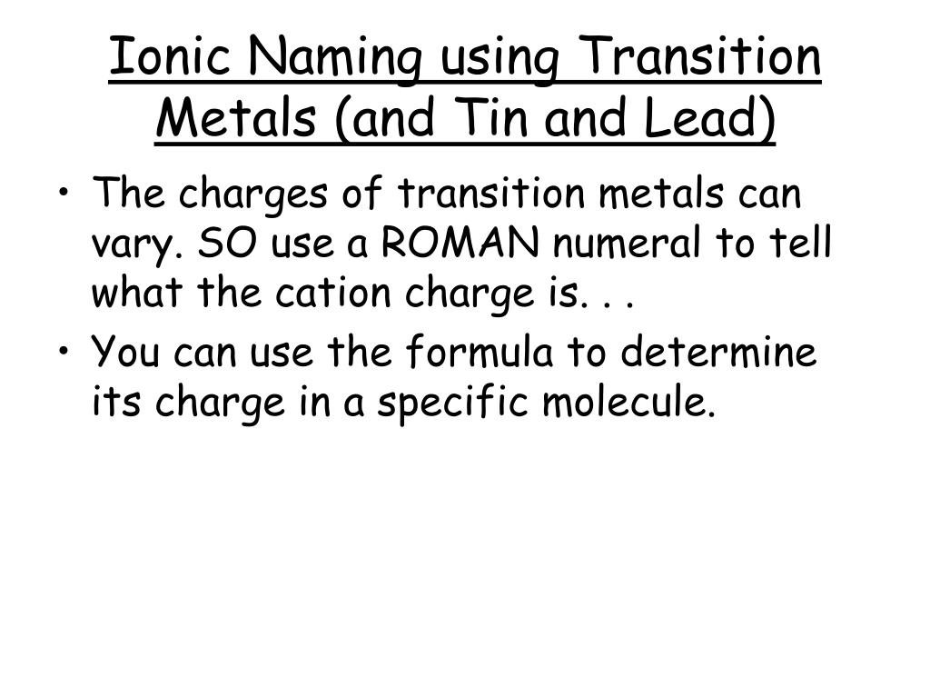 Ionic Naming using Transition Metals (and Tin and Lead) • The charges of transition metals can vary. SO use a ROMAN numeral to tell what the cation charge is. . . • You can use the formula to determine its charge in a specific molecule.