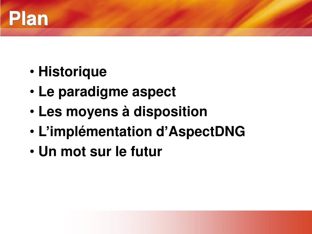 Plan • Historique • Le paradigme aspect • Les moyens à disposition • L’implémentation d’AspectDNG • Un mot sur le futur