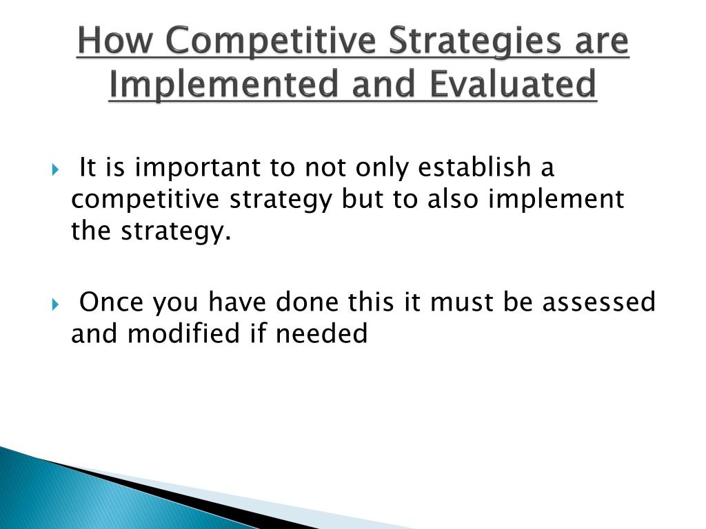 How Competitive Strategies are Implemented and Evaluated • It is important to not only establish a competitive strategy but to also implement the strategy. • Once you have done this it must be assessed and modified if needed