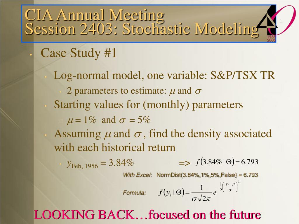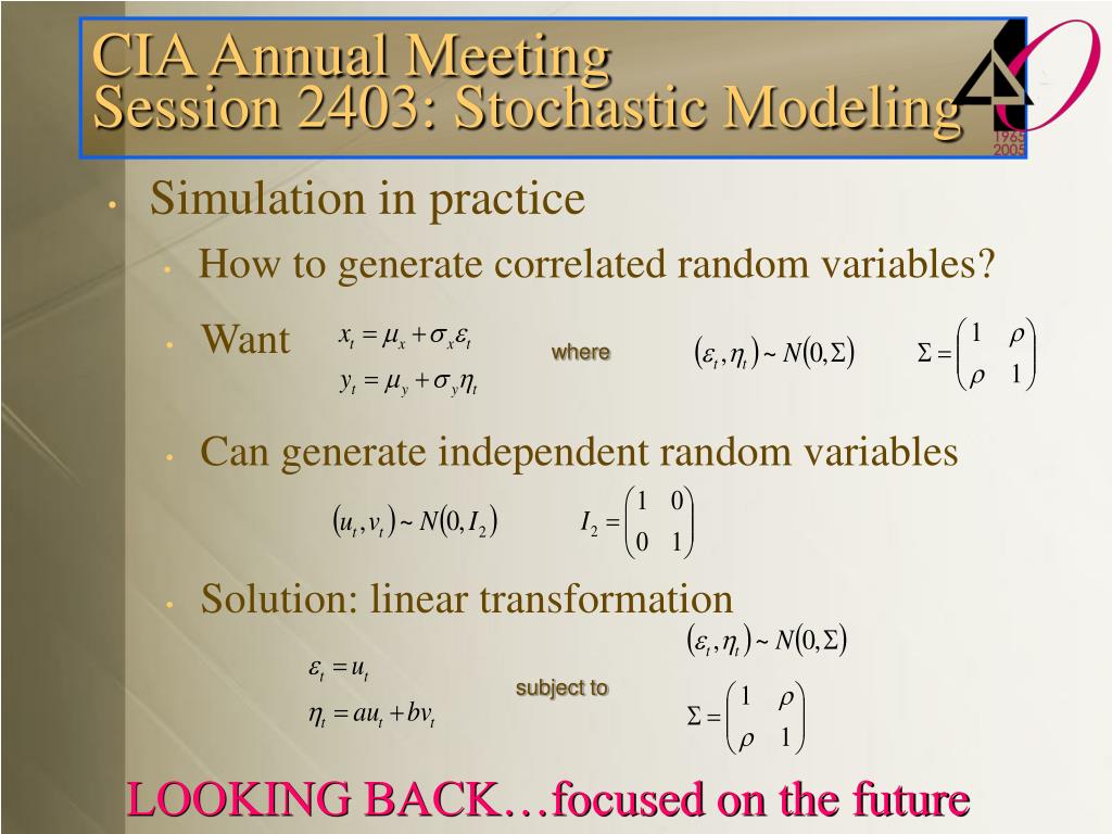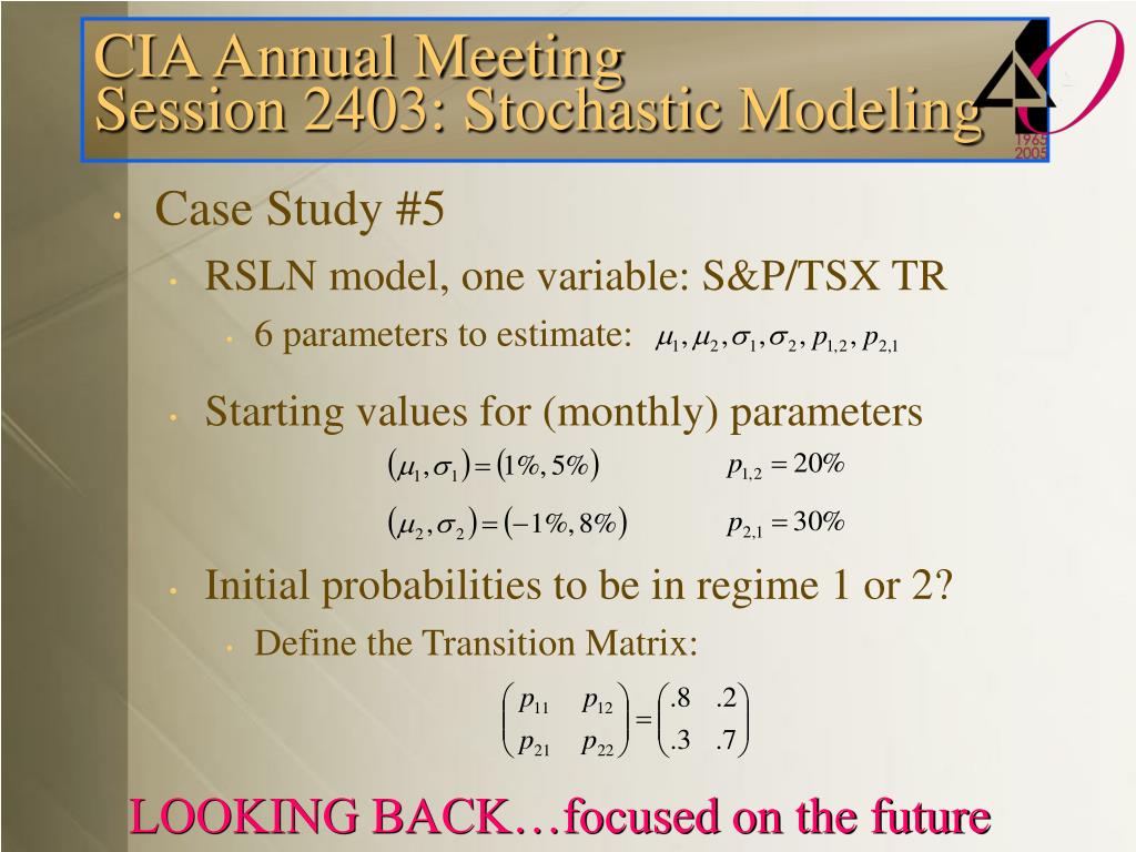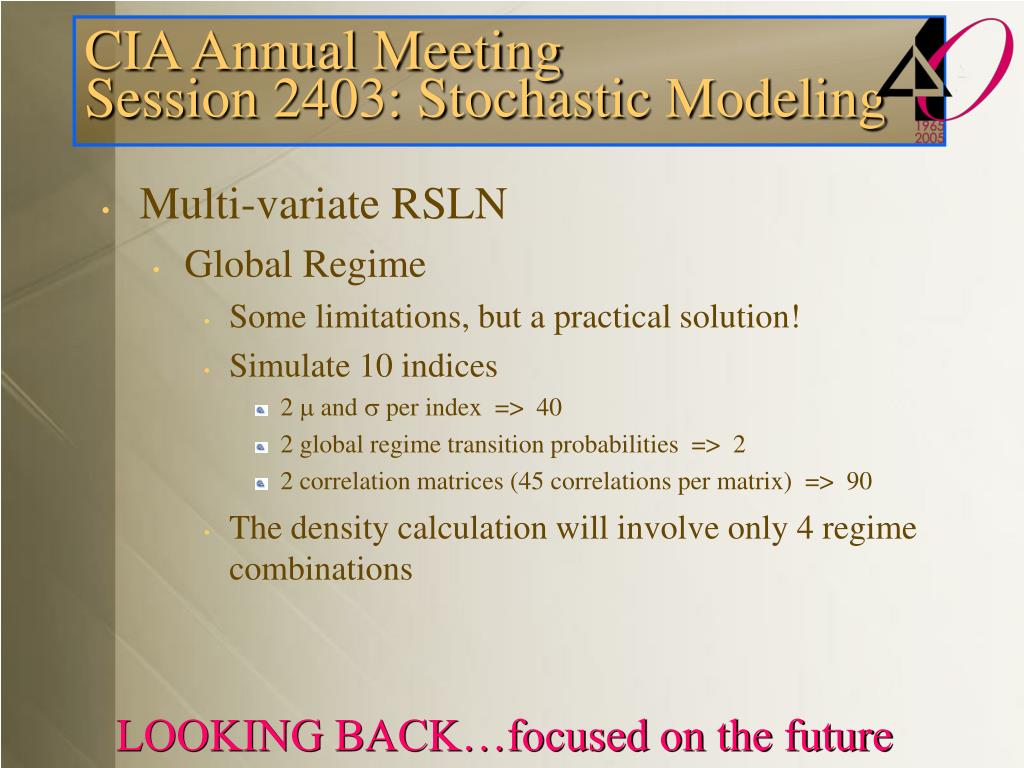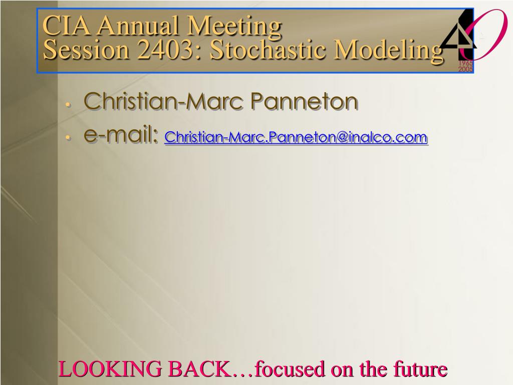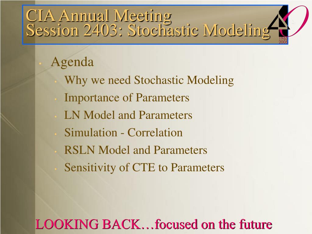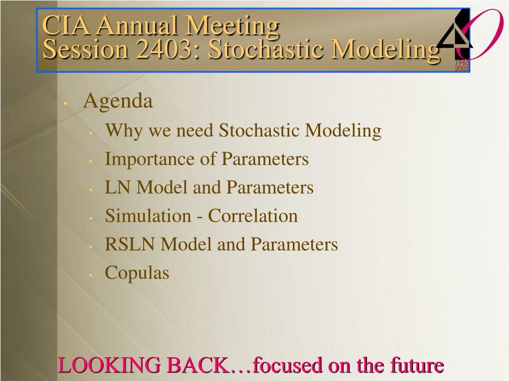 CIA Annual Meeting. LOOKING BACK…focused on the future. Christian-Marc Panneton e-mail: Christian-Marc.Panneton@inalco.com. Agenda Why we need Stochastic Modeling Importance of Parameters LN Model and Parameters Simulation - Correlation RSLN Model and Parameters Copulas.
